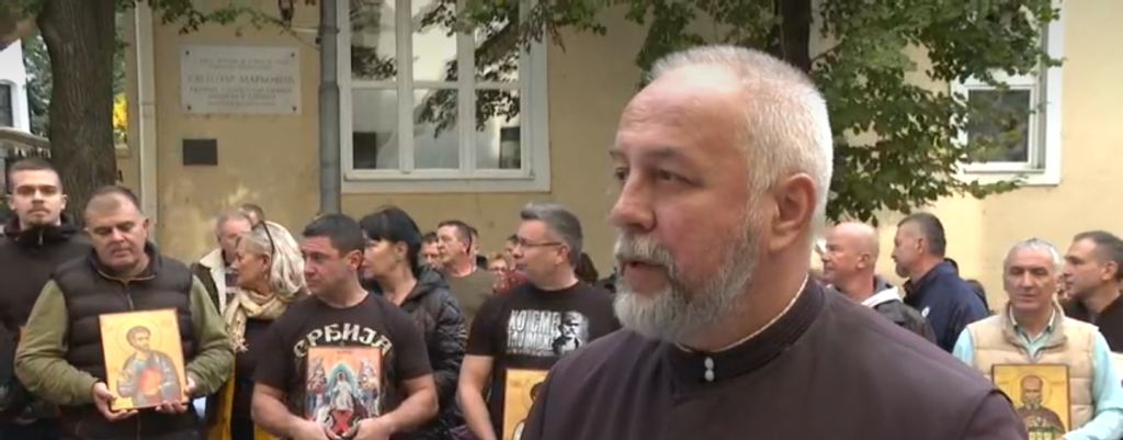 Свештеник Велимир Бирманц и верници пред Патријаршијом, фото: Printscreen