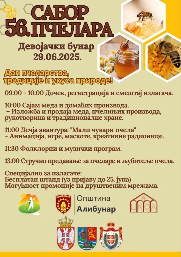 Уз подршку Покрајинског секретаријата за регионални развој, међурегионалну сарадњу и локалну самоуправу, затим Општине Алибунар, Туристичка организација општине Алибунар по 56. пут организује једну од најзначајнијих манифестација на простору Делиблатске пешчаре – Сабор пчелара.