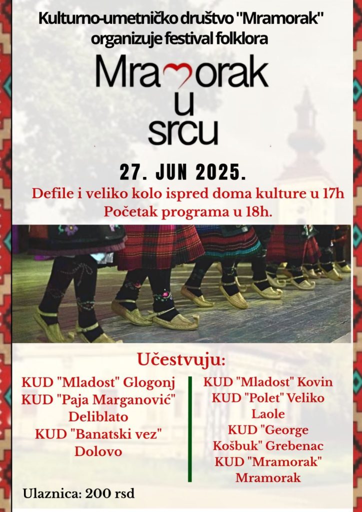 У петак, 27. јуна у сали Дома културе одржаће се фестивал фолклора под називом „Мраморак у срцу“.