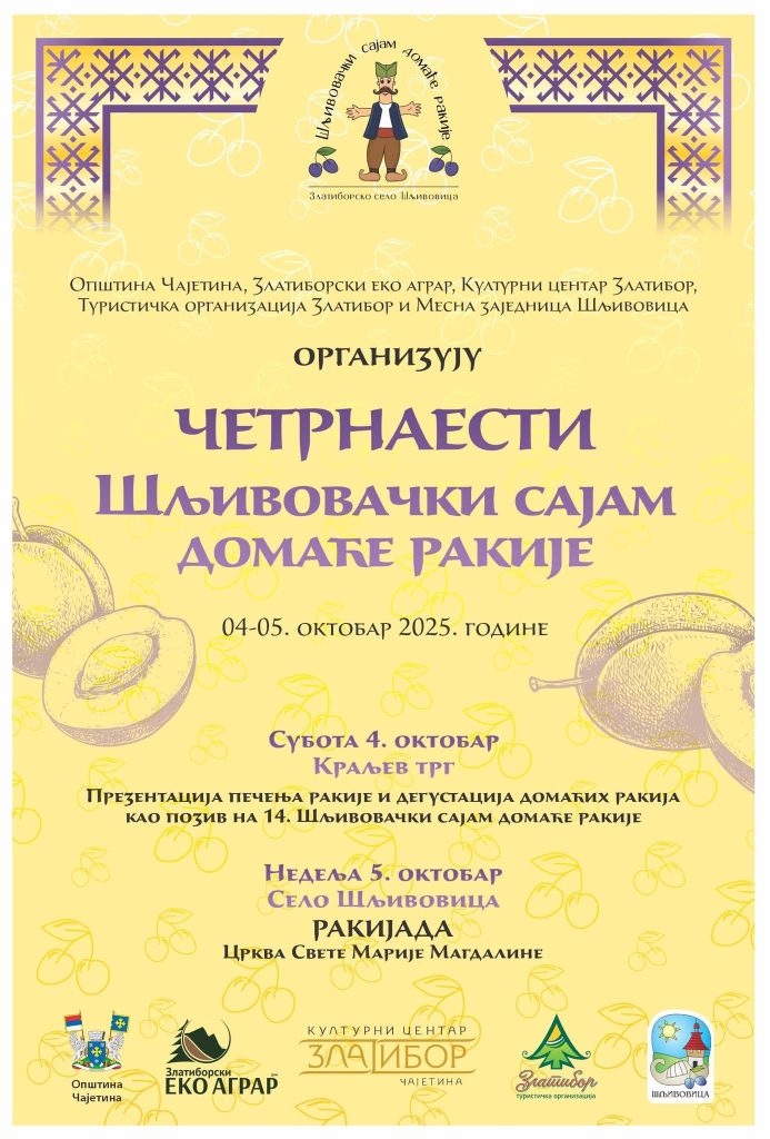 У организацији Златиборског Еко Аграра и уз подршку Општине Чајетина, Туристичке организације Златибор, Културног центра Златибора и Месне заједнице Шљивовица, 4. и 5. октобра, у селу Шљивовица, одржаће се 14. Шљивовачки сајам домаће ракије.