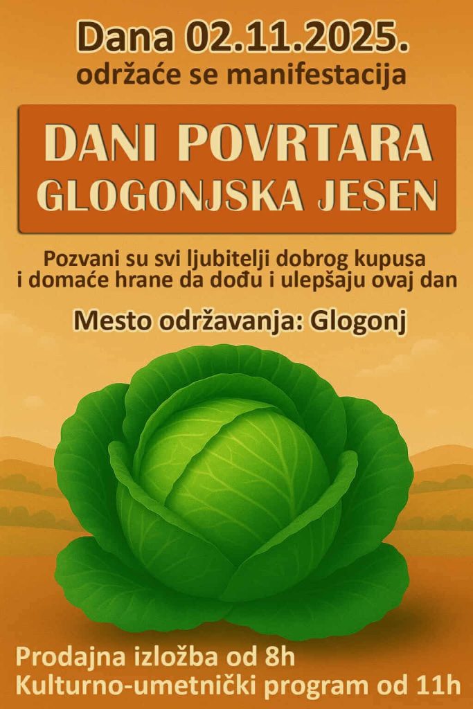 Привредно-туристичка манифестација „Глогоњска јесен“ одржаће се у недељу, 2. новембра, у Глогоњу, селу које је чувено по производњи купуса, карфиола и кромпира.