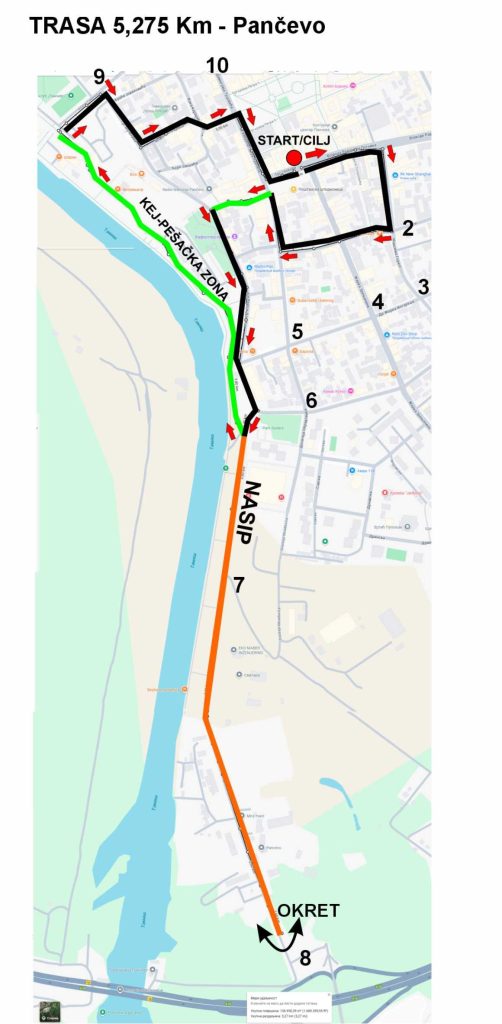 Како се најављује, тркачка стаза у дужини од 5,3 км пружаће се следећим улицама: Војводе Радомира Путника, Максима Горког, др Светислава Касапиновића, Војводе Петра Бојовића, Николе Тесле, Кејом Радоја Дакића, насипом Кеја Радоја Дакића и окретом код ЈРБ-а, горњом страном кеја – пешачком зоном, паркинг зоном обале Тамиша, Тргом мученика (поред ДДОР-а), Игњата Барајевца, Штросмајеровом и Улицом генерала Петра Арачића.