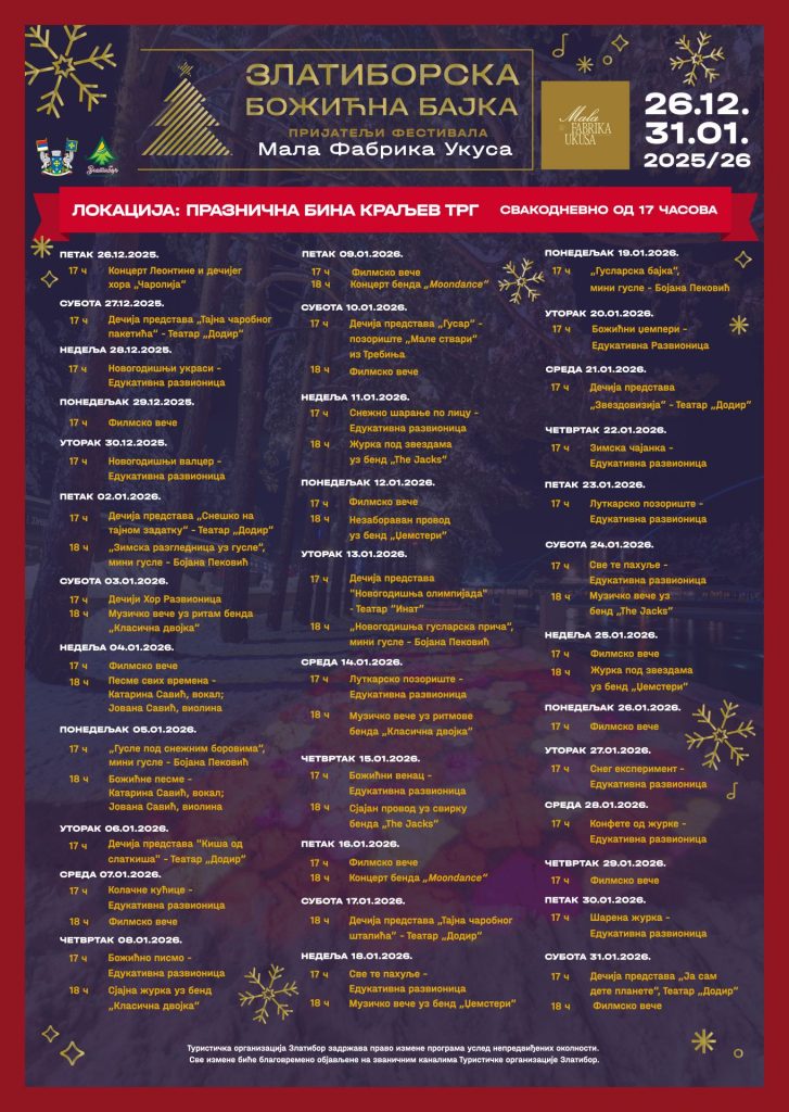 Богат и разноврсни новогодишњи програм на Златибору употпуниће и фестивал „Златиборска божићна бајка“, који се одржава од 26. децембра до 31. јануара 2026. године.